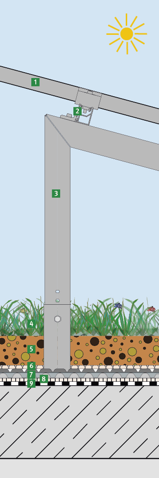 Монтажная рама для солнечных батарей с опорой на нагрузку, состоящая из опорной плиты, кронштейна и дренажно-накопительной панели FKD 25MA